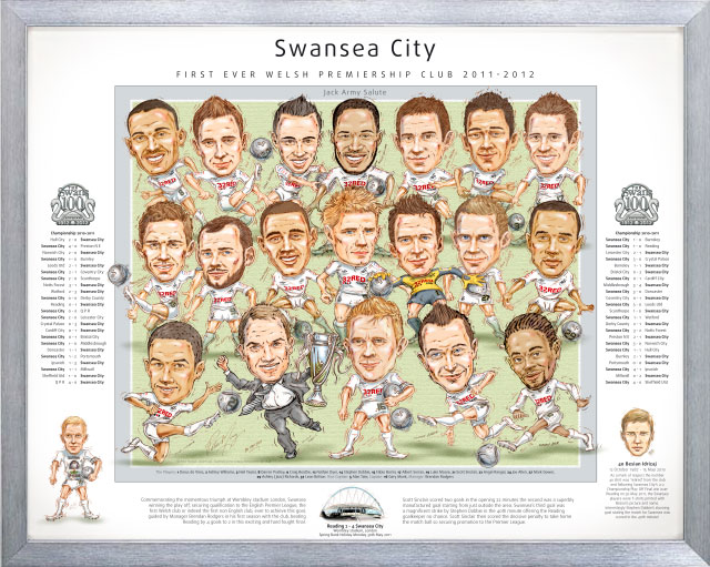 Swansfootball.com brings you this momentous Centenary print celebrating 100 years of football in the 2011-2012 season and in the year Swansea City wins qualification to the English Premier League. Guided by manager Brendan Rodgers in his first season with the club, Swansea City are the first Welsh club ever to achieve this goal. Their momentous triumph at Wembley stadium saw Swansea beat Reading in an exciting and hard fought final. Reading 2-4 Swansea City. As a tribute to the players, this Art quality commemorative print features players from the winning team with their manager Brendan Rodgers in caricature, and lists all the games and scores of the successful Championship Season. Printed in full colour with Swans White border, on high quality 350gsm Art board, distinctively framed in silver and black with a tough acrylic clear face, the overall size is 530mm x 435mm (21″ x 17″ approx).
