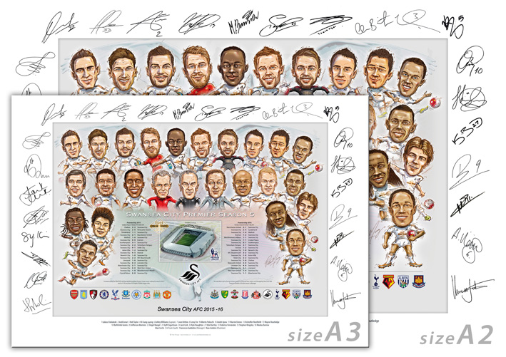 Swans Premier Season 5 – A2 (594 x 420mm) Commemorating the squad and management who may change the history of Swansea City Association Football Club. Ending the season with 47 points in 12th position of 20 English Premier League clubs, going to press a Welsh club but maybe in foreign ownership next season! Guided by Chairman Huw Jenkins and Managed by Francesco Guidolin in his first season as Manager. Order now, P&P and signed for Royal Mail delivery included. Swansea City 5th Premier Season Commemorating this pivotal 5th Premiership season in the history of Swansea City Association Football Club.